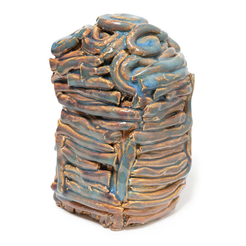 Ruth Howard is a multi-disciplinary artist working in painting and ceramics on an intimate scale. In her minimalist paintings, a single object floats on a flat plane, emphasising the interplay between shape and negative space. Her ceramic sculptures explore organic form and the transformative nature of glaze, often depicting abstracted creatures and natural elements that appear newly formed from the earth or sea. By layering and stacking clay, Howard creates vertical structures that feel organic and elemental. Their textured surfaces drip with glaze, accentuating each curve and indentation to create tactile works that invite both touch and quiet reflection.