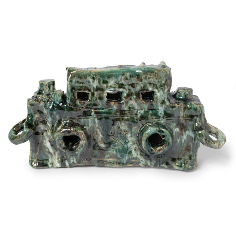 Alan Constable is an accomplished ceramicist, painter, and draughtsman, best known for his ceramic cameras and optical instruments, including telescopes and binoculars. Legally blind, Constable works closely with referent objects, committing their forms to memory before crafting them in clay. His hand-built pieces are pinched, pushed, and moulded, resulting in a gestural tactility with lustrous, wet-finish glazes. This lifelong fascination began in childhood when he made cardboard replicas of cameras.